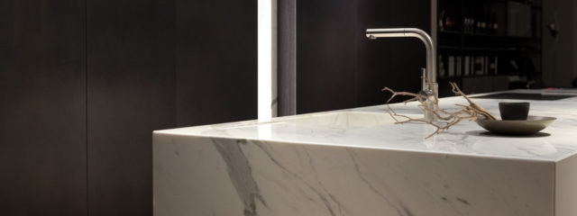 Stylish Solid White Marble Kitchen Counter With Dark Cupboards